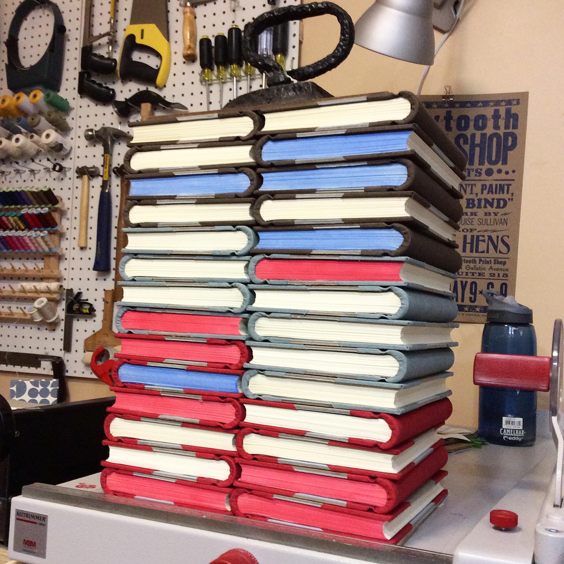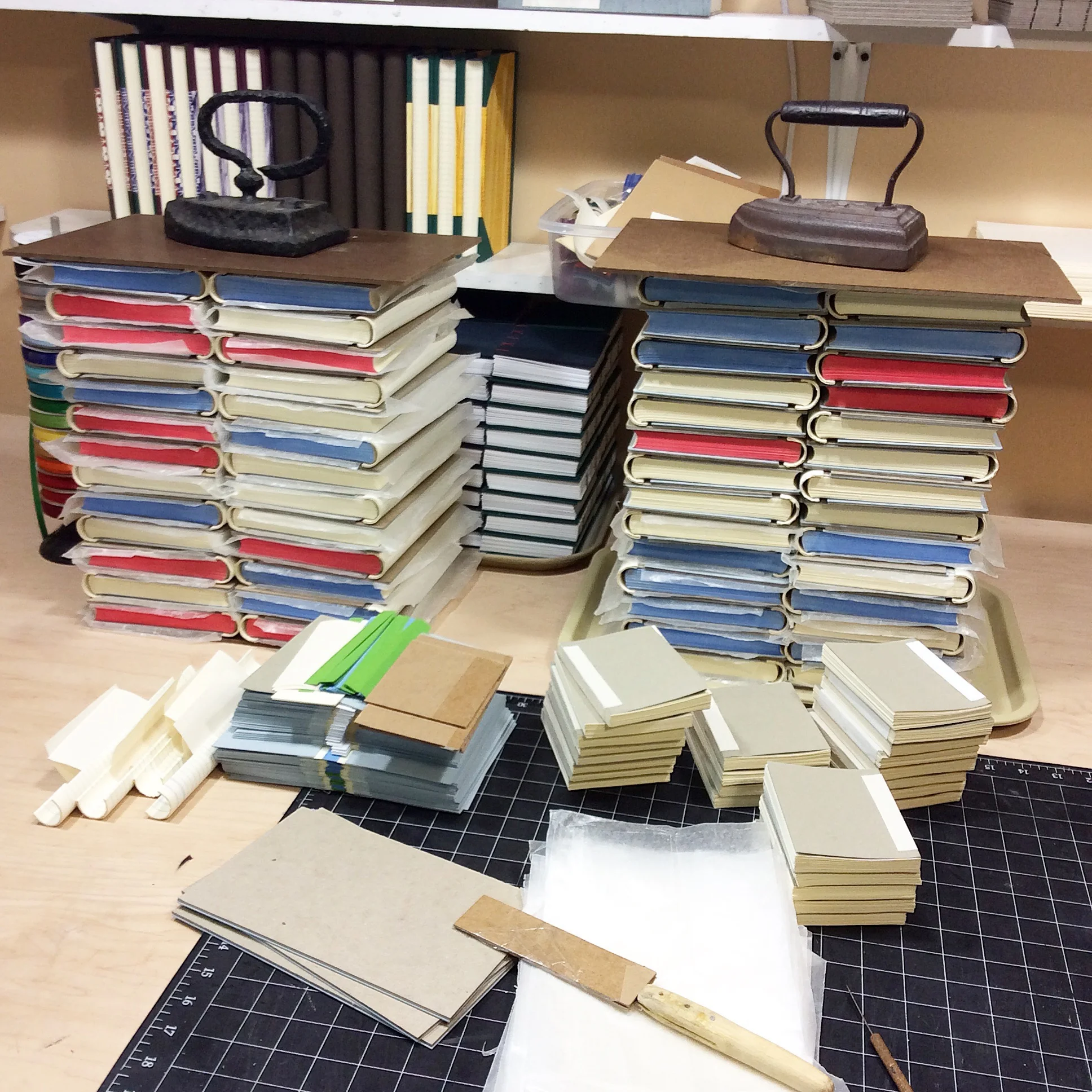 A stack of new springback journals drying underweight, waiting for their decorative papers.